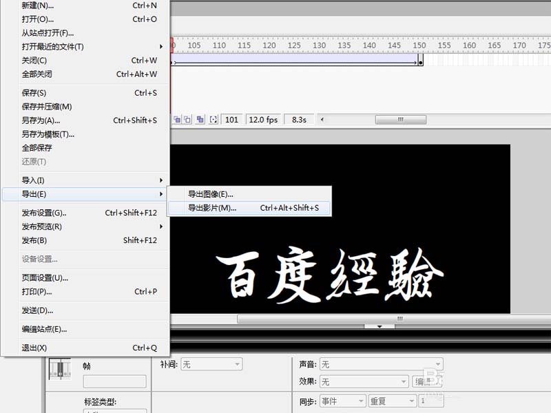2、選擇工具箱里的文本工具,在舞臺上輸入文字內(nèi)容“百度經(jīng)驗”,設(shè)置大小為100,顏色為白色。