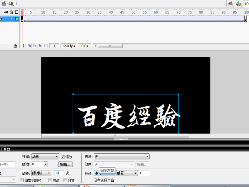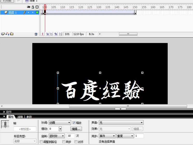 3、在100幀處插入關(guān)鍵幀,選擇第一幀,修改屬性面板中的補間為動畫,順時針10次。