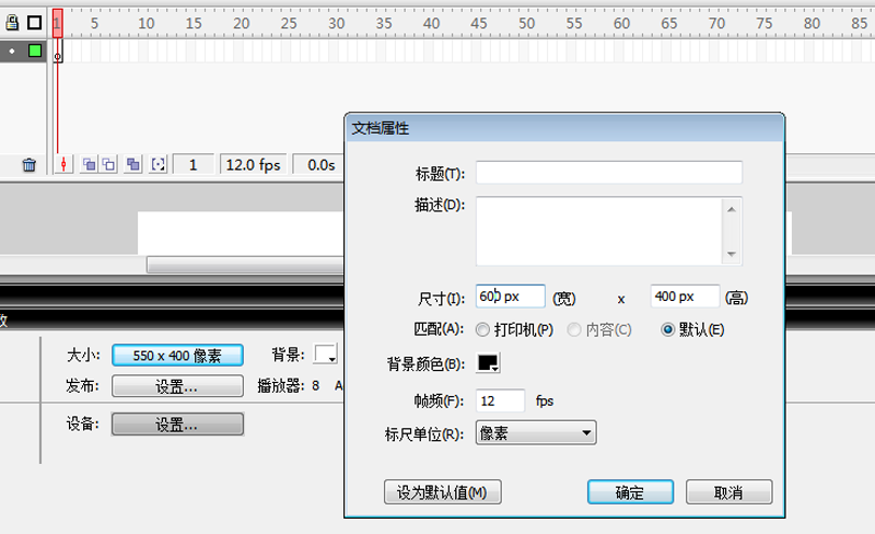 1、首先啟動flash,新建一文檔,設(shè)置大小為600*400,幀頻為12,背景顏色為黑色。