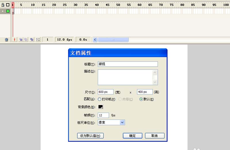 1、首先啟動flash8,新建一個標題為漸現,大小為600*400,幀頻為12fps,背景顏色為白色的文檔。