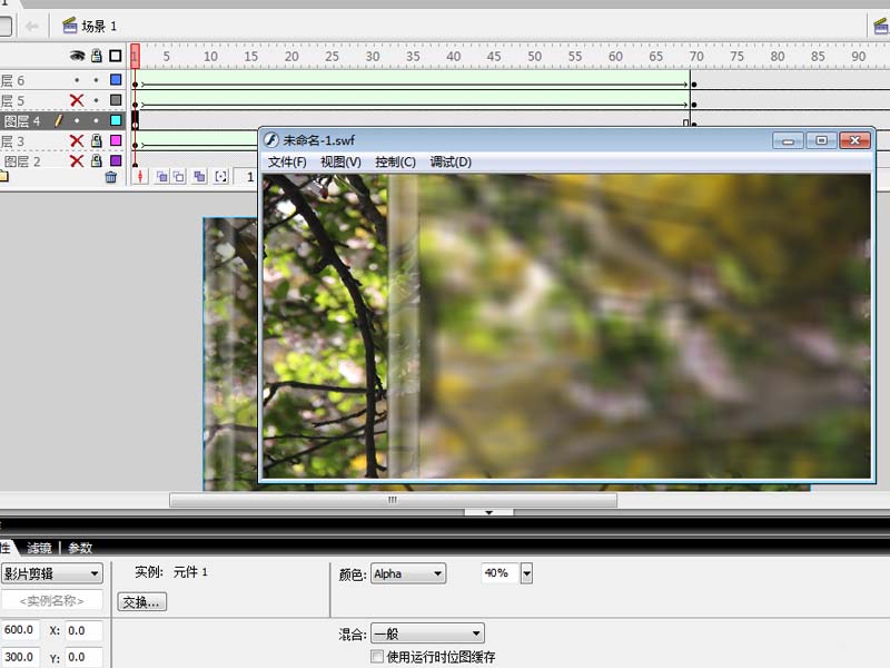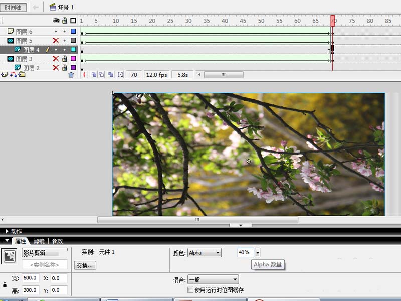 13、圖層4,5解鎖,關(guān)閉圖層2,3,5,選擇圖層4,修改圖層4第一幀和第70幀處的元件的alpha值為40%。