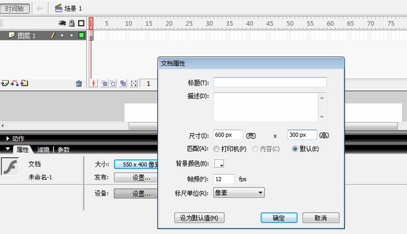 1、首先啟動(dòng)flash8,新建一文檔,設(shè)置大小為600*300,幀頻為12,背景顏色為白色的文檔。