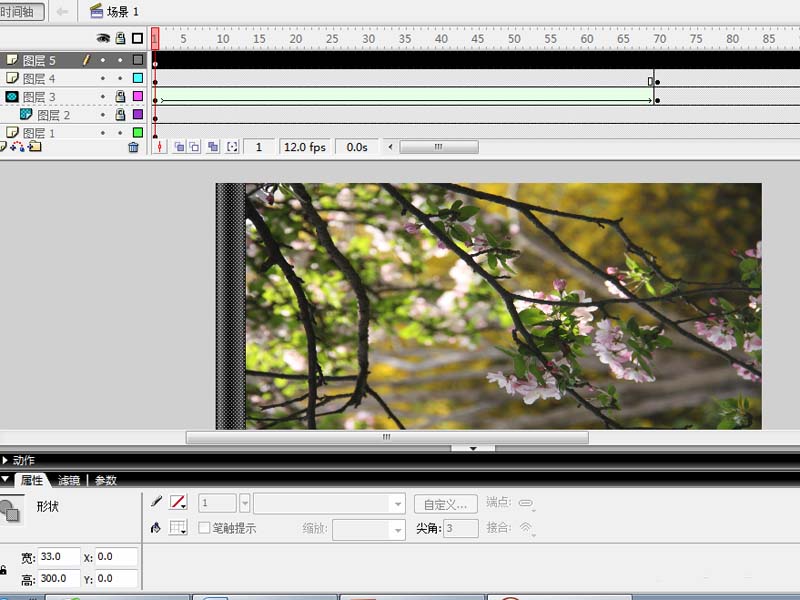 11、在圖層5的70幀處插入關(guān)鍵幀,位置設(shè)置為600,0,并設(shè)置形狀補(bǔ)間,新建圖層6.