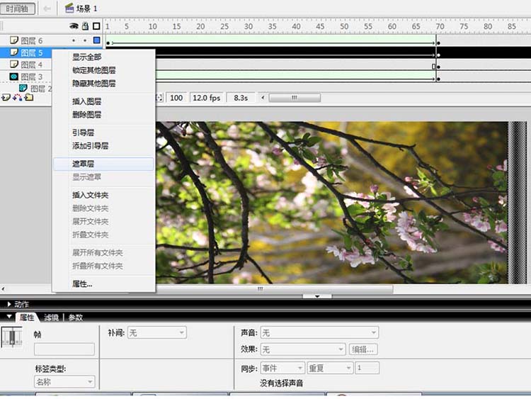 12、復(fù)制圖層5的所有幀,粘貼到圖層6上,右鍵單擊圖層5從下拉菜單中選擇遮罩層選項(xiàng),將圖層5設(shè)置為遮罩層。