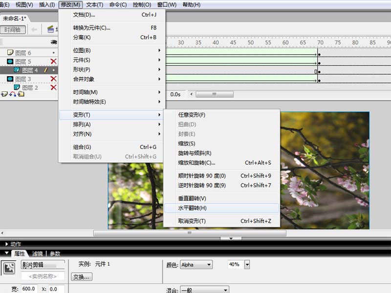 14、選擇圖層4的第一幀,選擇元件,執(zhí)行修改-變形-水平翻轉(zhuǎn)命令,執(zhí)行ctrl+enter組合鍵測試動(dòng)畫。