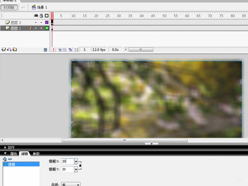 5、選擇圖層2中的元件修改屬性面板中的濾鏡屬性,添加模糊,設(shè)置數(shù)值為20。