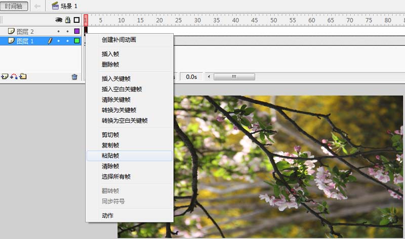 4、接著在100幀處插入幀,新建圖層2,右鍵單擊圖層1的第一幀,選擇復(fù)制幀選項(xiàng),選中圖層2第一幀右鍵單擊選擇粘貼幀。