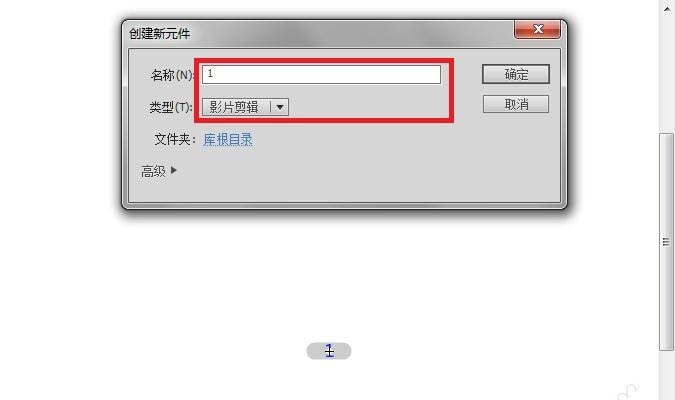 8、新建一個名為“1”的影片元件,將“按鈕”圖形元件拖入,并插入文本“1”。