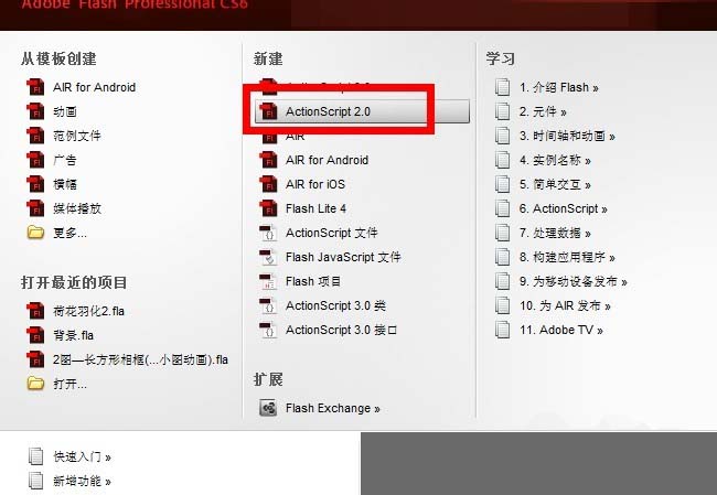 2、選擇“ActionScript2.0”,新建一個舞臺。