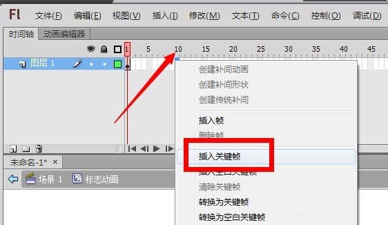 7、點擊第10幀,右擊,選擇“插入關鍵幀”。