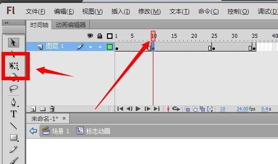 9、點中第10幀的關鍵幀,選擇“任意變形工具”。