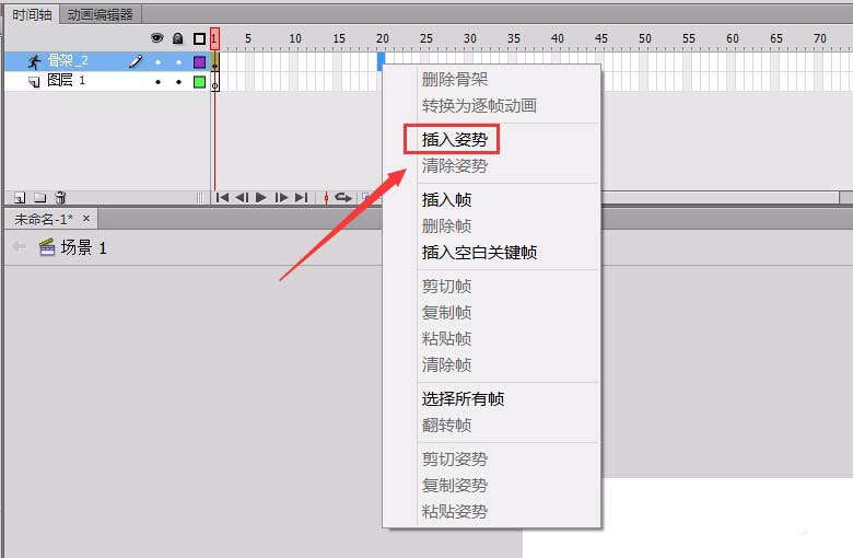 8、在時間軸上的第二十幀處,單擊鼠標右鍵,在彈出的菜單里找到插入姿勢選項,如圖所示: