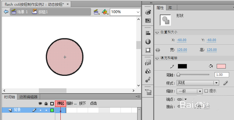 2、雙擊時間軸上圖層1,將圖層1命名為背景, 用按住SHIFT鍵用橢圓工具(快捷鍵O )在場景中畫一正圓(大小120X120,邊線#000000,填充#FFCCCC)。 分別在“指針經(jīng)過”、“按下”與“點擊”幀上插入關鍵幀(快捷鍵F6)。
