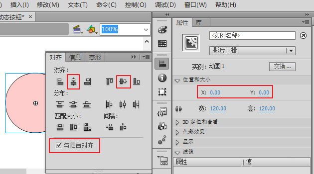 方法2:Ctrl+K打開對齊窗口,分別選擇與舞臺對齊、水平中齊及垂直中齊 。