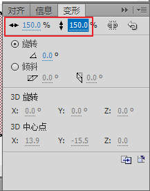 4、單擊編輯菜單中粘貼到中心位置(快捷鍵Ctrl+V),在時間軸上第10幀點擊右鍵并選擇插入關鍵幀(快捷鍵F6 ),單擊窗口菜單下變形(快捷鍵Ctrl+T),將寬度與高度調整為150%,在時間軸上第1幀上單擊右鍵選擇創(chuàng)建補間形狀 。