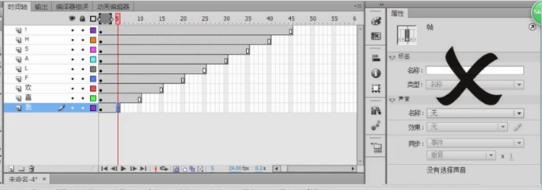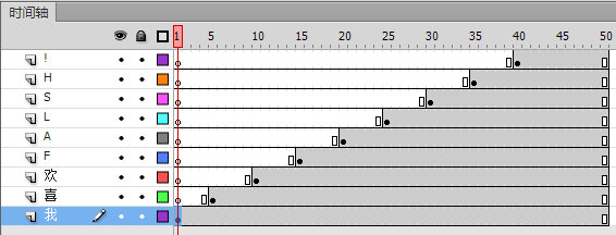 8、按“shift”選中每層的第50幀,點鼠標(biāo)右鍵插入幀;然后分別將“喜”、“歡”、“F”、“L”、“A”、“S”、“H”、“!”圖層的第1幀移動到下圖相應(yīng)的位置,點擊測試場景測試。移動幀操作:先選中要移動的幀,當(dāng)鼠標(biāo)形狀變?yōu)閹摼€矩形時按下鼠標(biāo)左鍵即可移動位置,每層第一幀的位置,代表了該文字出現(xiàn)的時間。