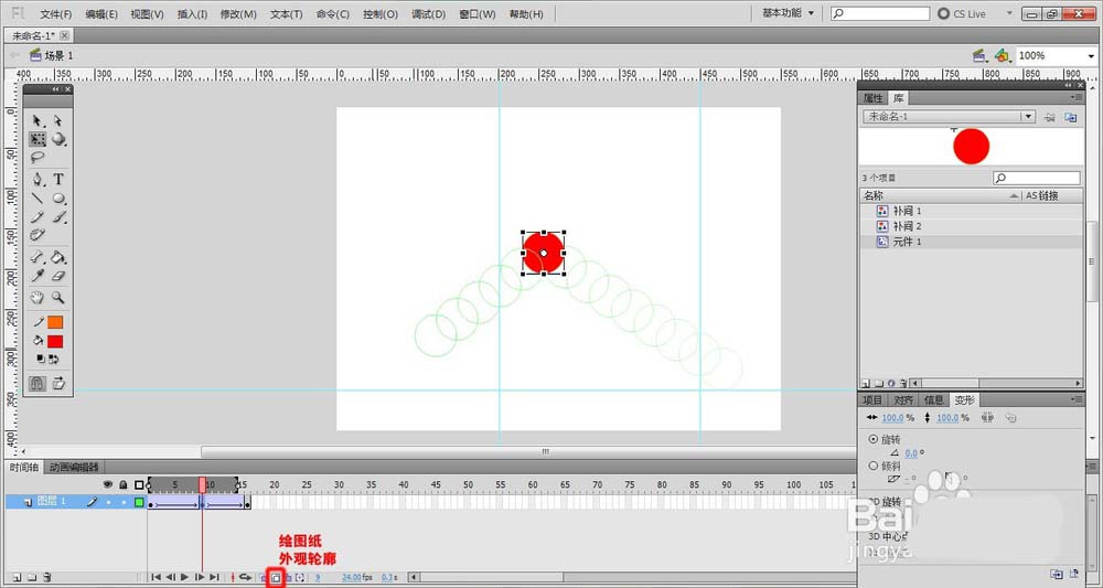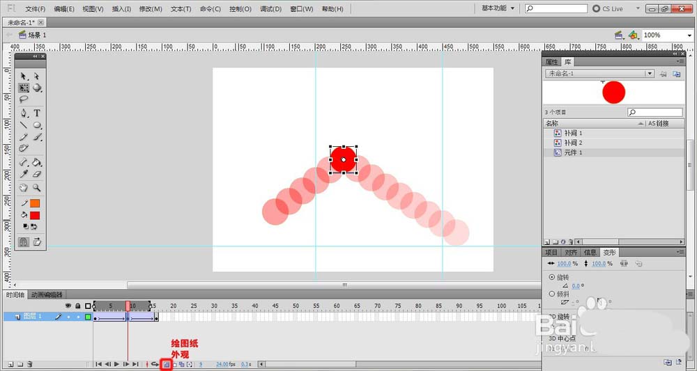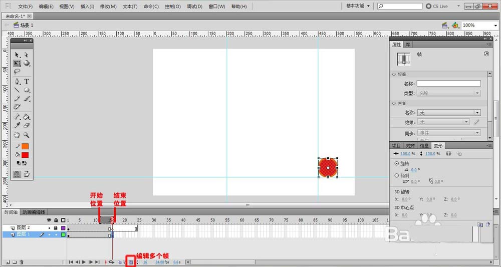 5、當需要同時處理、修改連續的多個幀內容時,單擊“編輯多個幀”按鈕,可同時對對象進行移動、縮放等操作。