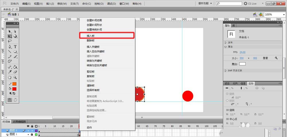 2、選擇幀后確定編輯位置,“插入幀”相當于將前一關鍵幀內容延長至該幀,而“插入關鍵幀”則相當于將前一關鍵幀內容復制并粘貼至該幀。