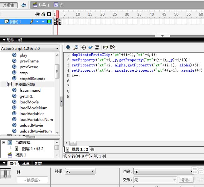 10、修改背景顏色為你喜歡的顏色,接著從庫(kù)中拖拽“光”元件到場(chǎng)景上,設(shè)置全居中,按ctrl+enter組合鍵進(jìn)行動(dòng)畫測(cè)試。
