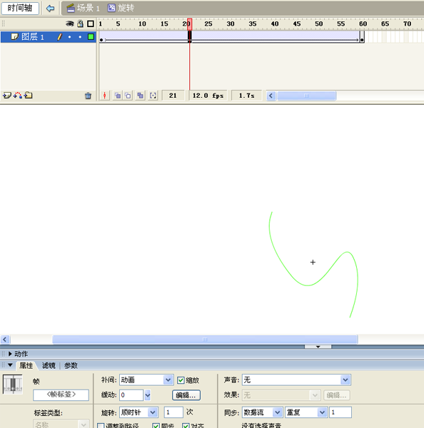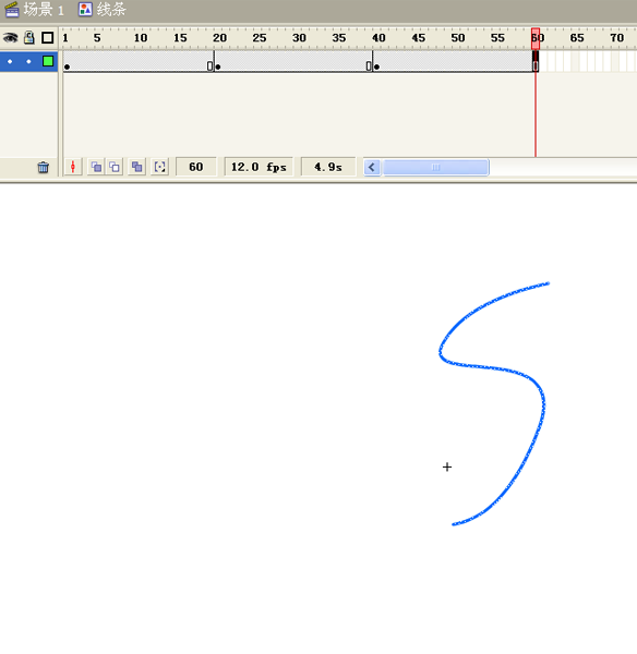 3、選擇工具箱里的鋼筆工具,在舞臺(tái)上繪制一個(gè)“s”形狀,在20幀、40幀處按f6鍵插入關(guān)鍵幀,并分別改變其顏色,在60幀處插入幀。