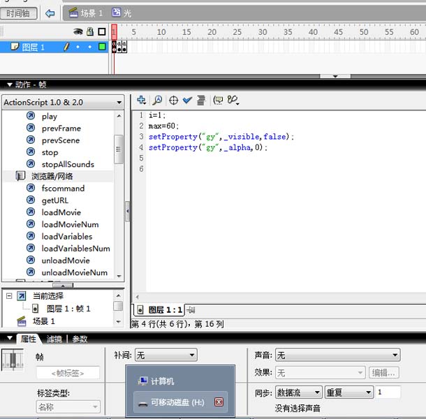 8、在第二幀處插入關(guān)鍵幀,設(shè)置亮度為60%,第三幀插入關(guān)鍵幀,亮度設(shè)置為0,選擇第一幀,輸入實(shí)例名稱為“gy”并輸入相應(yīng)代碼。
