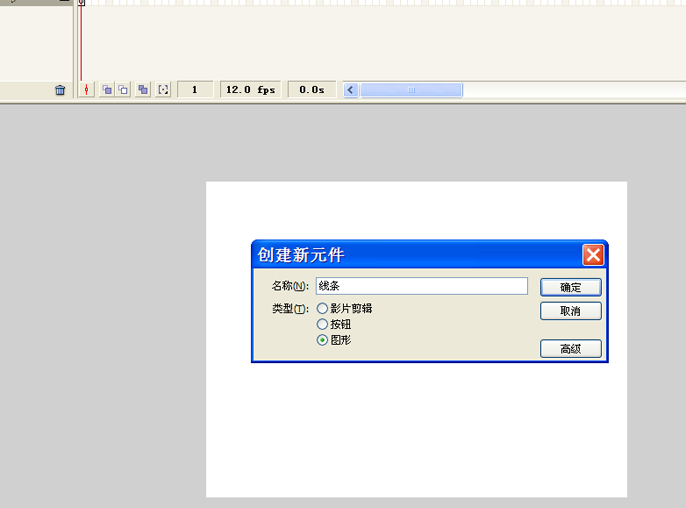 4、執(zhí)行插入-新建元件命令,新建一個(gè)名稱為“旋轉(zhuǎn)”的影片剪輯元件,點(diǎn)擊確定進(jìn)入編輯區(qū)域,在第一幀處拖入庫(kù)中的“線條”元件。