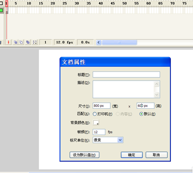 1、首先啟動(dòng)flash8,新建一個(gè)大小為800*600,幀頻為12fps,背景顏色為白色的文檔。