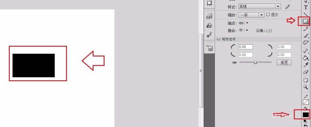 3、選擇“矩形工具”,顏色任意,這里我們選擇黑色,在舞臺(tái)上任意畫(huà)一個(gè)框,因?yàn)楹竺嬉{(diào)整為透明的,所以什么顏色都可以的。