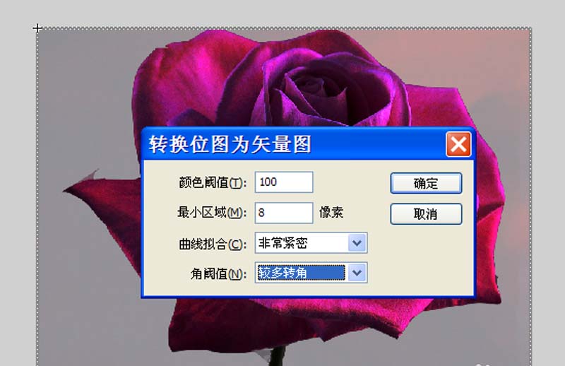 4、雙擊舞臺上的玫瑰花進(jìn)入影片剪輯的編輯區(qū)域,新建圖層2,將庫中的玫瑰花拖拽到編輯區(qū)域,選擇該玫瑰花,執(zhí)行修改-位圖-轉(zhuǎn)換位圖為矢量圖命令,在彈出的對話框中設(shè)置曲線擬合為非常緊密,角閾值為轉(zhuǎn)多轉(zhuǎn)角,點擊確定。