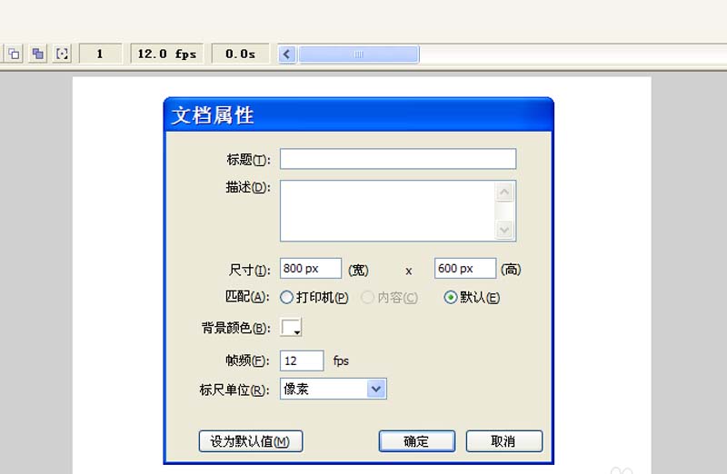 1、首先啟動flash8,新建一個大小為800*600,背景顏色為白色,幀頻為12fps的文檔。