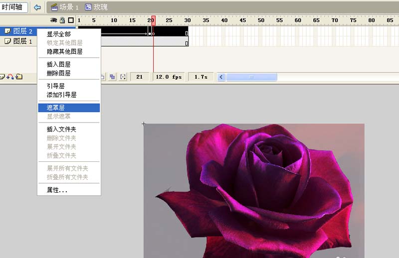 7、選擇圖層2的第21幀,右鍵單擊從下拉菜單中選擇插入空白關(guān)鍵幀,右鍵單擊圖層2,從下拉菜單中選擇遮罩層選項。
