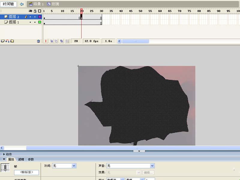 5、打開屬性面板設(shè)置填充顏色為黑色,分別在圖層1和圖層2的第30幀處插入幀,在圖層2的第20幀處插入關(guān)鍵幀。