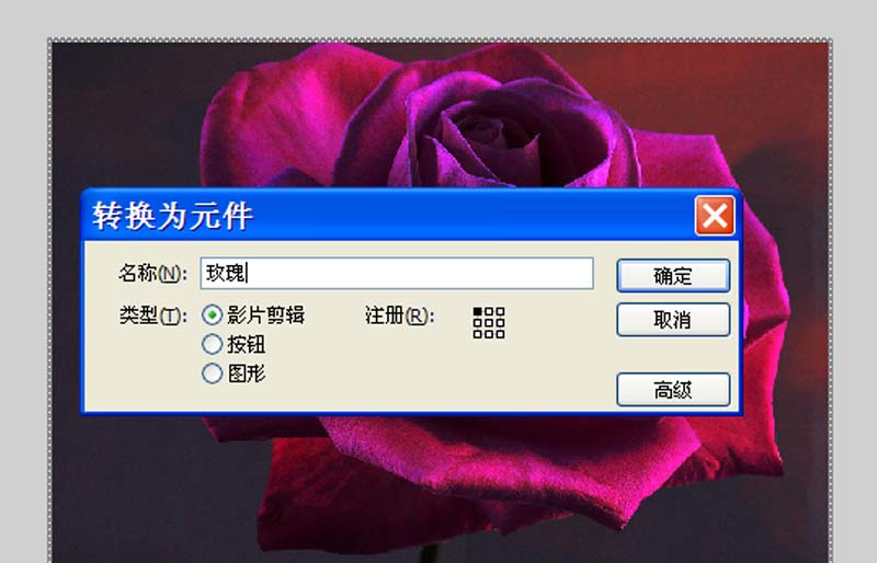 3、采用同樣的方法導(dǎo)入玫瑰花,鎖定圖層1,右鍵單擊玫瑰花從下拉菜單中選擇轉(zhuǎn)換為元件選項,設(shè)置類型為影片剪輯,點擊確定按鈕。