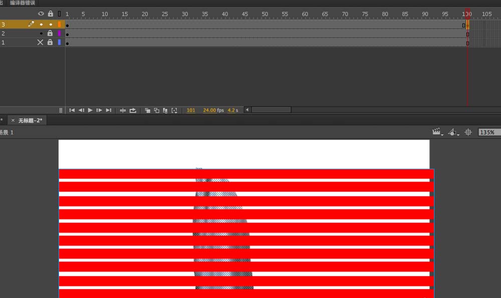 4、在第100幀的時候添加幀,然后新建一個圖層,將圖層一的圖片原封不動的復制過來,這時候也是100幀,將圖層一鎖定并且關閉眼睛,選中圖層二的圖片,打散,快捷鍵CTRL+B