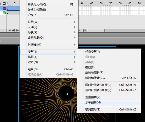 8、新建圖層2,采用同樣方法將圖形元件拖拽到影片剪輯中去,并設置全居中,執行修改-變形-水平翻轉命令,并在第30幀處按f6插入關鍵幀。