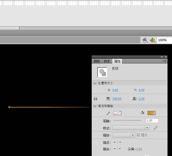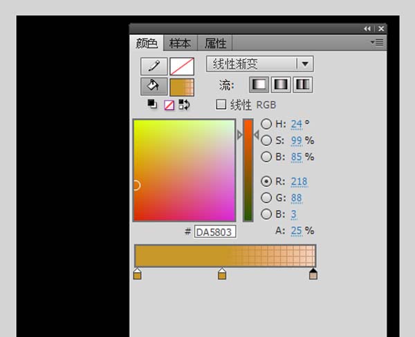 2、選擇工具箱里的矩形工具,設置筆觸顏色為無,填充顏色為線性漸變,設置右邊的坐標顏色為淡黃色,并修改其alpha為25%,中間色標為黃色,左邊的色標為深黃色。