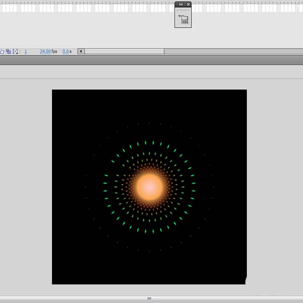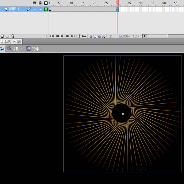 11、返回場景1,拖拽影片剪輯到舞臺中并設置全居中,這樣光芒萬丈的太陽動畫就制作完成了。