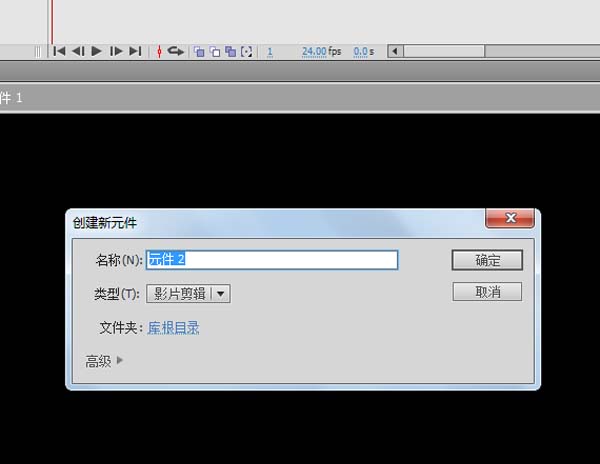 6、執行插入-新建元件命令,在彈出的新建元件對話框中、設置類型為影片剪輯,點擊確定進入編輯區域。