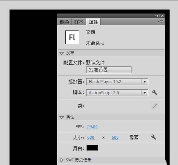 1、首先啟動flash cs5,執行文件-新建命令,新建一個大小為600*600,幀頻為24fps,背景顏色為黑色的文檔。