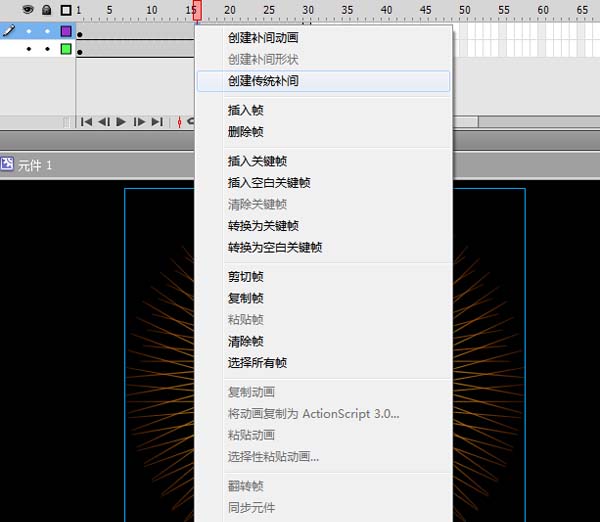 9、在圖層中的任意一幀處右鍵單擊從下拉菜單中選擇創建傳統補件動畫選項,設置屬性里補件旋轉為逆時針一周,接著右鍵單擊圖層2從下拉菜單中選擇遮罩層。