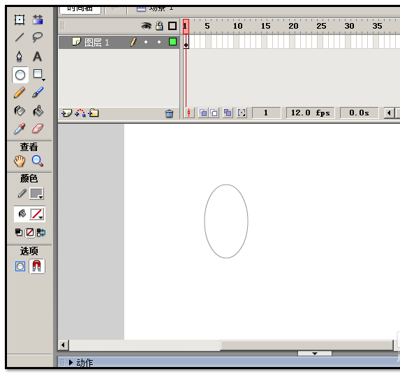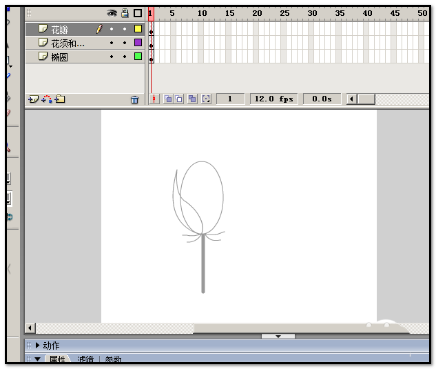 4、然后,把圖層1命名為“橢圓”,并在舞臺上畫出一個橢圓。再新建一個圖層命名為“花須和花梗”,然后,選取線條工具,設置筆觸顏色為灰色,在橢圓底部畫出左兩條須和右兩條花須,再畫一條花梗。
