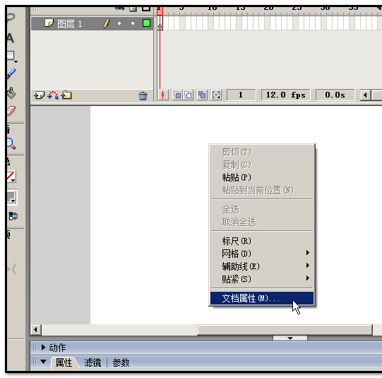 2、如果文檔舞臺尺寸不符合自己的要求,可以鼠標在舞臺上右擊,在彈出的菜單中點“文檔屬性”。在彈出的操作框中,設置舞臺尺寸。