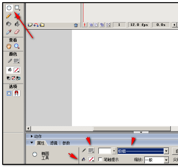 3、好,現在轉到正題,開始畫玫瑰花。在左側工具欄中點橢圓工具,然后,設置填充顏色為無;筆觸顏色為灰色。線條為極細型。