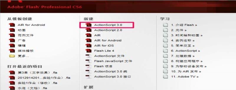 1、雙擊打開Flash CS6軟件,選擇并點擊【新建】欄下的【ActiveScript 3.0】創(chuàng)建新的Flash空白文檔。