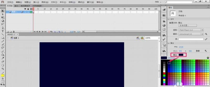 2、在左側的“屬性”面板中修改舞臺背景顏色為深藍色(亦可選擇自己喜歡的背景顏色)。