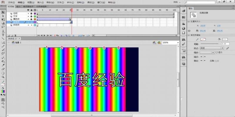 11、在“豎色塊”圖層的第26幀處插入空白關鍵幀,并用“矩形工具”繪制一個較為細長的矩形,復制粘貼出另外5個同樣的矩形,然后將其拼接在一起。