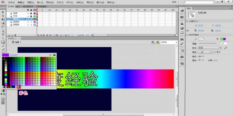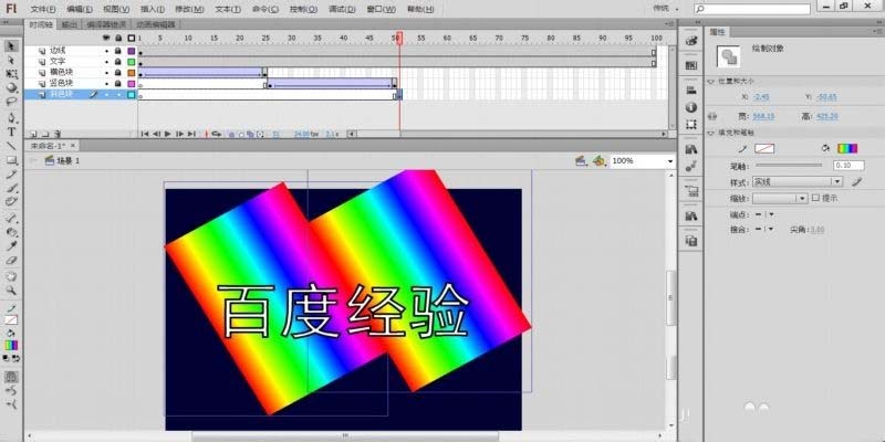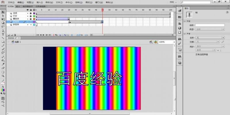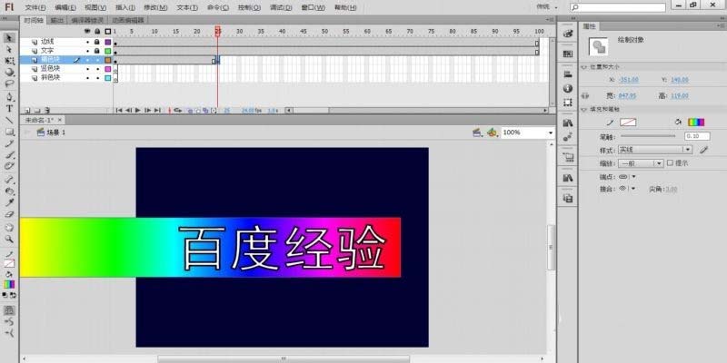 9、在“文字”和“邊線”層的第100幀處單擊右鍵選擇“插入幀”,選中“橫色塊”圖層,設置填充顏色為彩色,然后用“矩形工具”繪制一個較長的矩形,并移動到合適的位置。