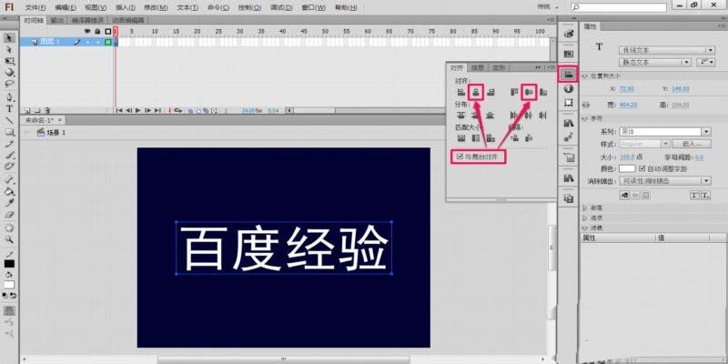 4、選中文字,打開“對齊”面板,勾選“與舞臺對齊”,并分別選擇和點擊“水平中齊”和“垂直中齊”。