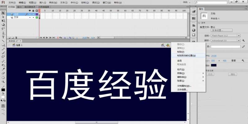 3、選擇“文本工具”,并在“屬性”面板中設置好文字的大小、顏色等參數,并在舞臺上輸入所需要的文字。