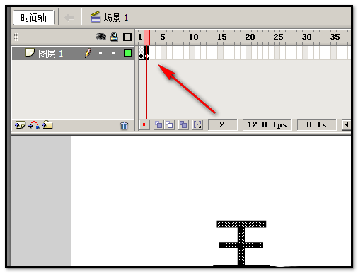 1、新建FLASH文檔;默認圖層為圖層1。在文檔圖層1舞臺上輸入文字,比如“王”字。
